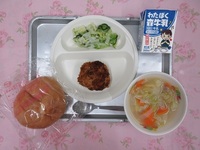 子どもパン キャベツたっぷりメンチカツ 野菜のスープ煮 グリーンサラダ 牛乳