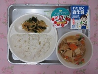 麦ごはん 生揚げと豚肉の味噌煮 中華和え アセロラゼリー 牛乳