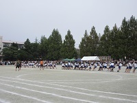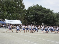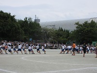 5年生は、綱引き「5ーGo 綱引き ~心を燃やせ~」をしました。チームごとに並び順や走者を変えたり綱の引き方を工夫したりするなど、作戦を取り入れて行いました。1回戦は「プラチナフラッシュチーム」、2回戦は「ブラックホールチーム」が勝ちました。両者とも互角です!いよいよ3回戦。結果は「プラチナフラッシュチーム」が勝ちました!5年生のパワーが感じられる、名勝負でした!