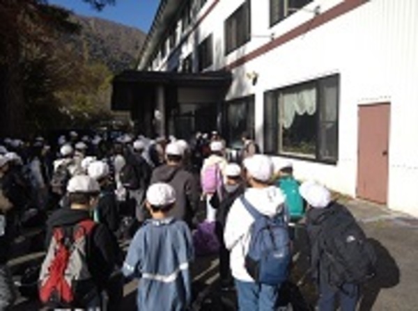 ホテル「花の季」での豪華な朝食を食べ終え、退館のつどいを行いました。ホテルの皆様へ1日お世話になったこと、素敵な思い出ができたことなど、感謝の思いを伝えていました。楽しい思い出のホテルを8時30分予定通りに出発し、次の見学場所である竜頭の滝に向かいます。いよいよ修学旅行2日目のスタートです!