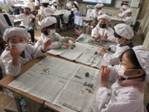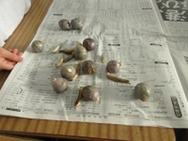 3年生でくわいの皮むきをしました。みんなが食べる給食のためだからと、いつも以上に入念に手を洗って、スタートするかわいい姿が見られました。はじめ、くわいがどんなものなのかあまりわからず、たくさんのくわいを見て、さわったりにおいをかいだりとくわいをいっぱい感じることができました。最後には、きれいに芽を取り皮をむいて、給食のくわいご飯もおいしくいただくことができました。