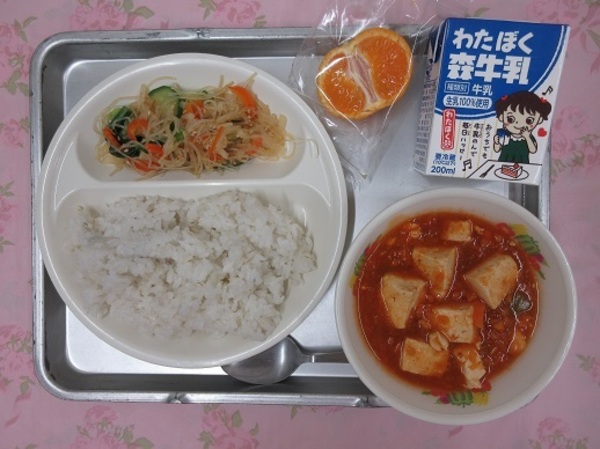 麦ごはん 牛乳 えびと豆腐のチリソース 春雨サラダ みかん