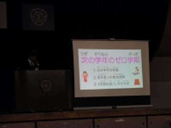 3学期は1~5年生は52日、6年生は50日と、最も短い学期です。また次の学年の0学期とも言われています。来年度の次の学年でどんな自分になりたいかを想像して、目標をたてて行動することが大切だという話がありました。