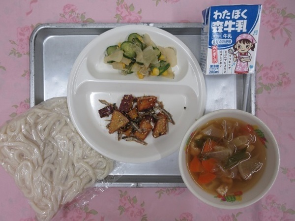 鶏ねぎ塩うどん 牛乳 小魚入り大学芋 大根とじゃこのサラダ