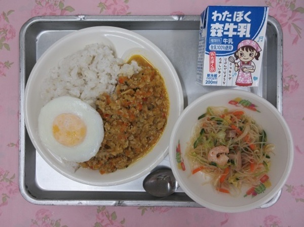 ガパオライス 牛乳 目玉焼き ヤムウンセン